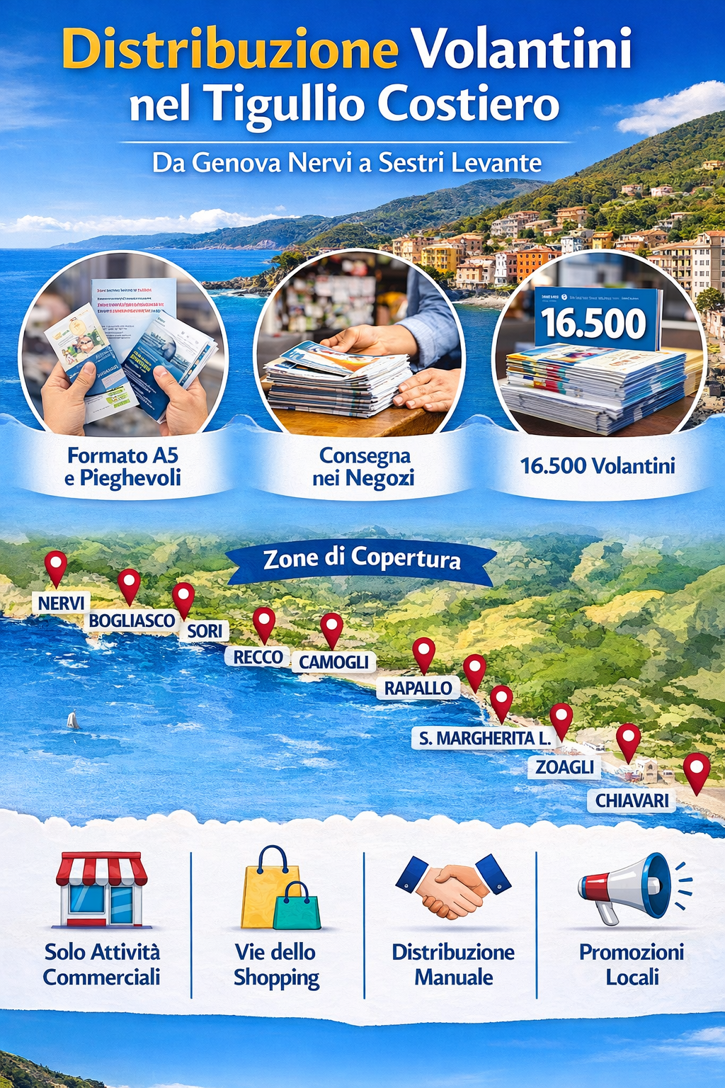 Offriamo un servizio specializzato di distribuzione volantini nel Tigullio costiero, con copertura completa della riviera da Genova Nervi a Sestri Levante.